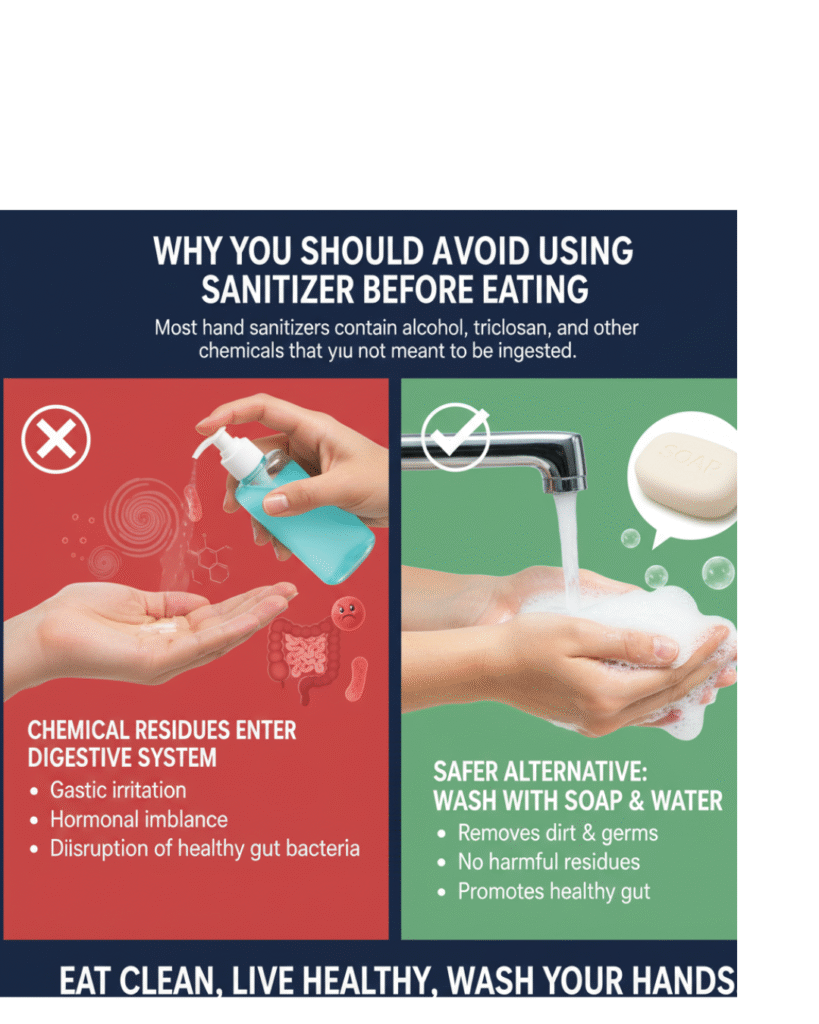 Although hand sanitizers occupy a legitimate place in public health—particularly in situations devoid of water access—their use before eating is physiologically ill-advised. The ingestion of even trace amounts of alcohol, synthetic additives, or chemical residues can disturb gastrointestinal harmony, impair microbial health, and diminish sensory satisfaction.